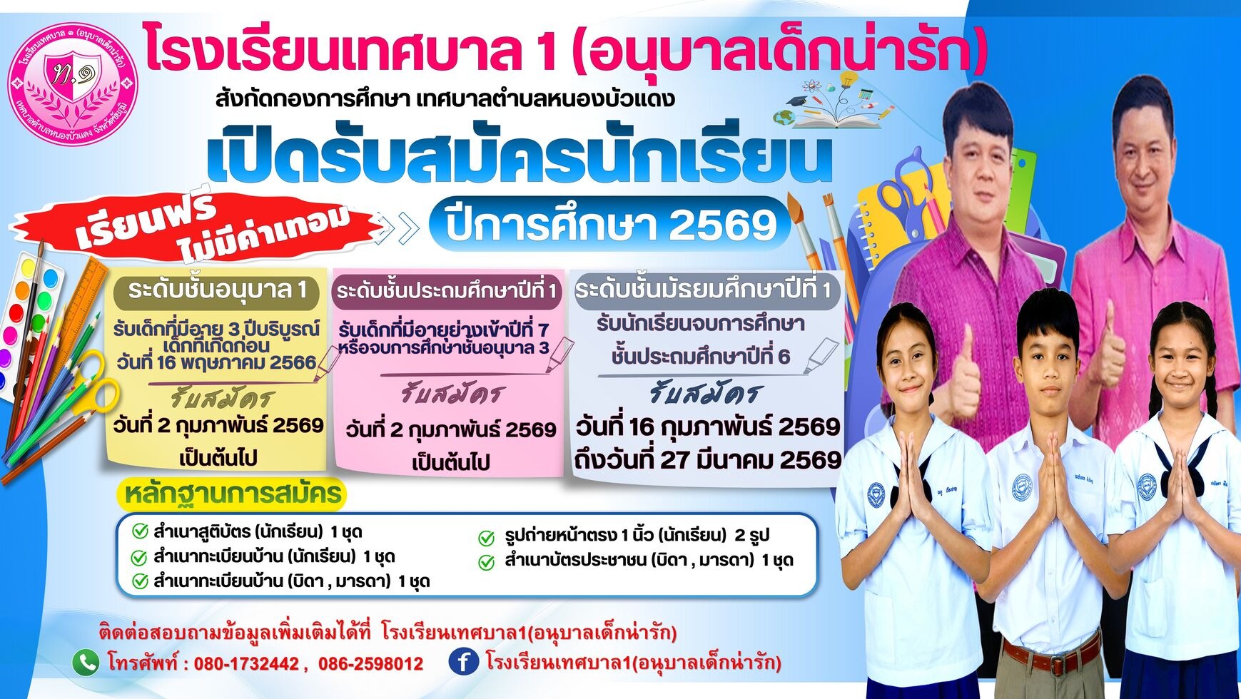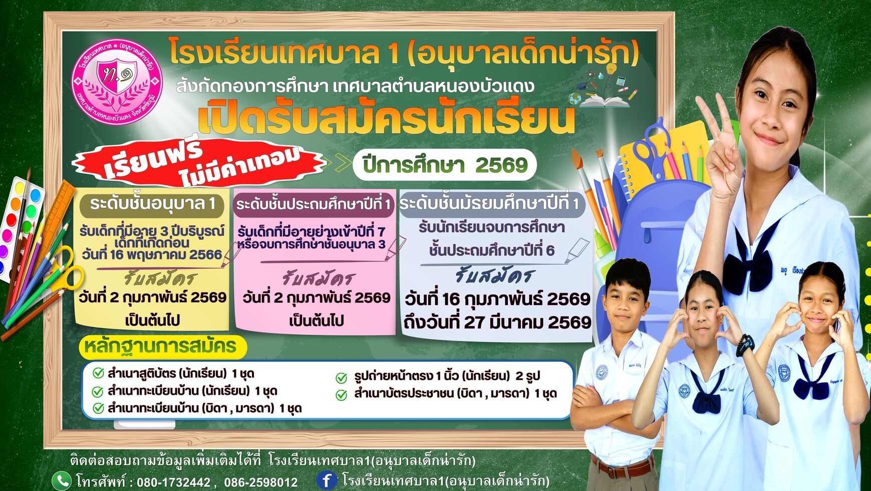 ? ประกาศโรงเรียนเทศบาล1(อนุบาลเด็กน่ารัก): เปิดรับสมัครนักเรียนใหม่ ประจำปีการศึกษา 2569 ✨เรียนฟรี ไม่มีค่าเทอมทุกระดับชั้น ?ขอเชิญชวนผู้ปกครองที่สนใจ ส่งบุตรหลานเข้าเรียนในสถานศึกษาคุณภาพของอำเภอหนองบัวแดง จังหวัดชัยภูมิ โดยมีรายละเอียดการรับสมัครดังนี